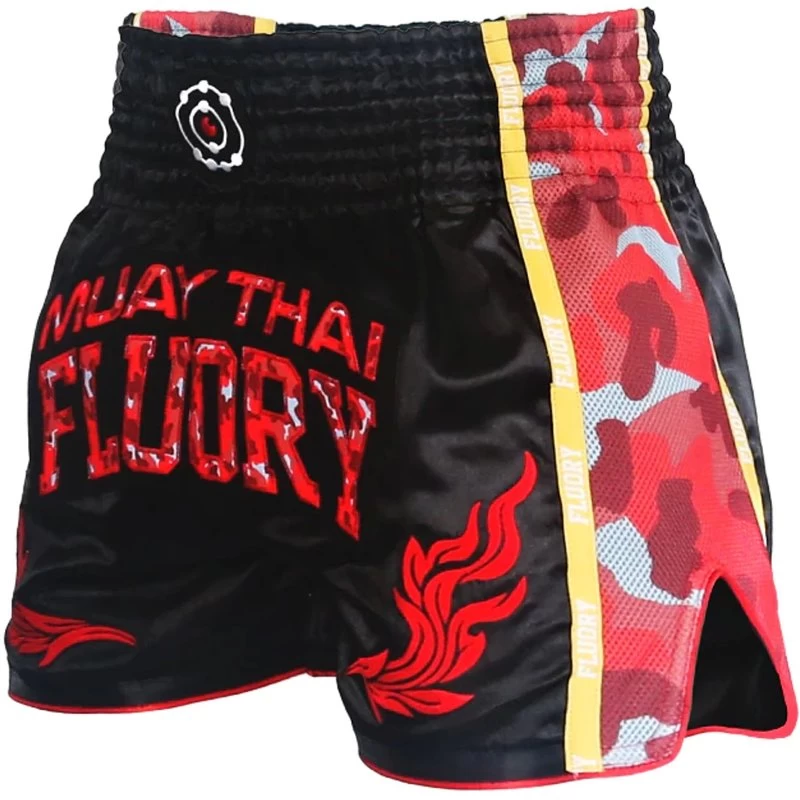 Fluory Muay Thai Shorts Kickboxing Zwart Camo Rood.