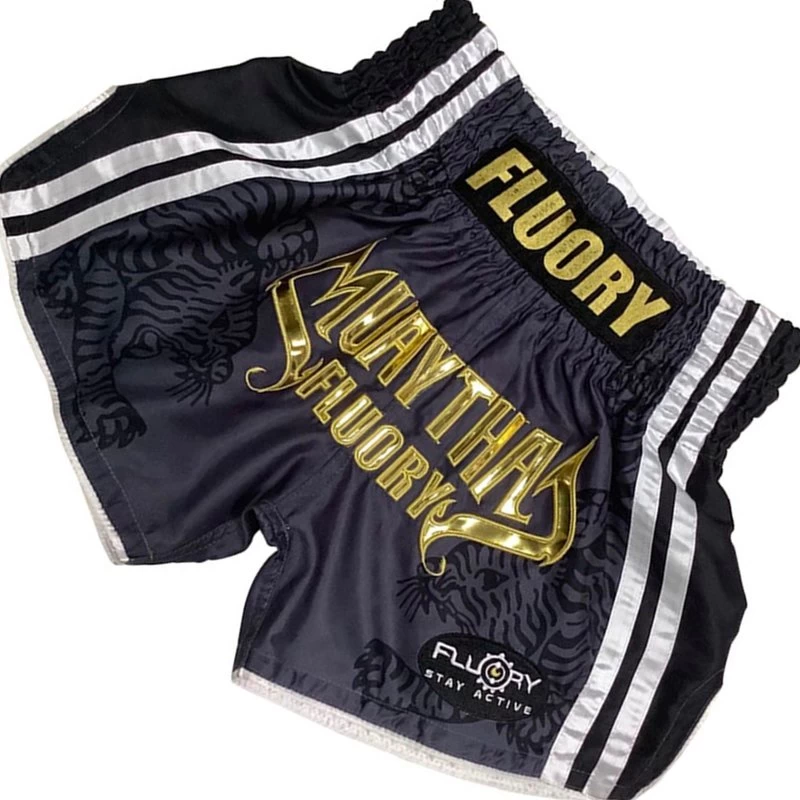 Fluory Sak Yant Tiger Muay Thai Shorts Grijs Goud MTSF98.